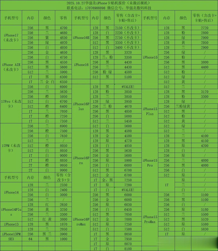 而最近的华强北美版卡贴机,尤其是iPhone17ProMax 星宇橙颜色的普遍涨价几百元(橙色价格基本持平白色,2T的还比白色贵50元),因为大家都在找可以变色的iPhone17ProMax 星宇橙,苹果遇到工艺问题的iPhone17ProMax 星宇橙也是采取了直接换机,目前也是在锁定出现问题的批次。